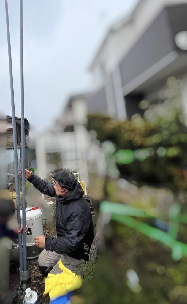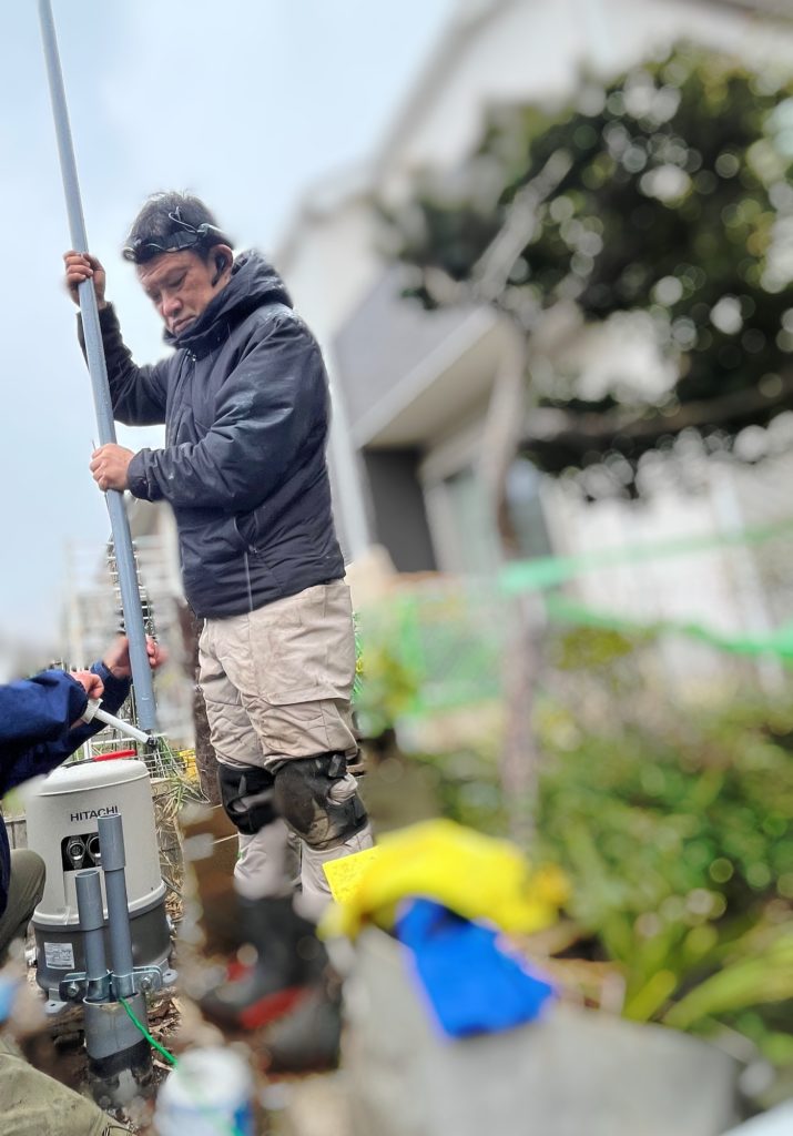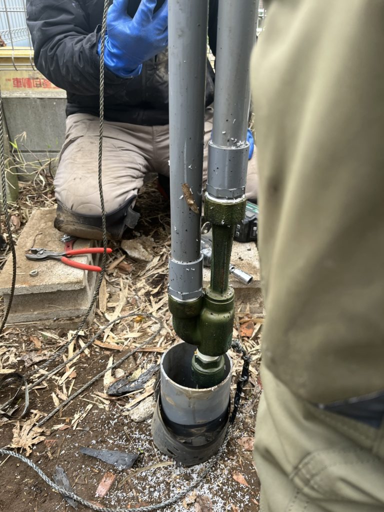 まずは、深井戸の配管を全て引き上げます。配管には水が入っているため、こちらの作業は男性2人でもかなり重いです!後から配管の長さを測ったら、約20メートルでした!20メートル分の配管を全て引き上げました。