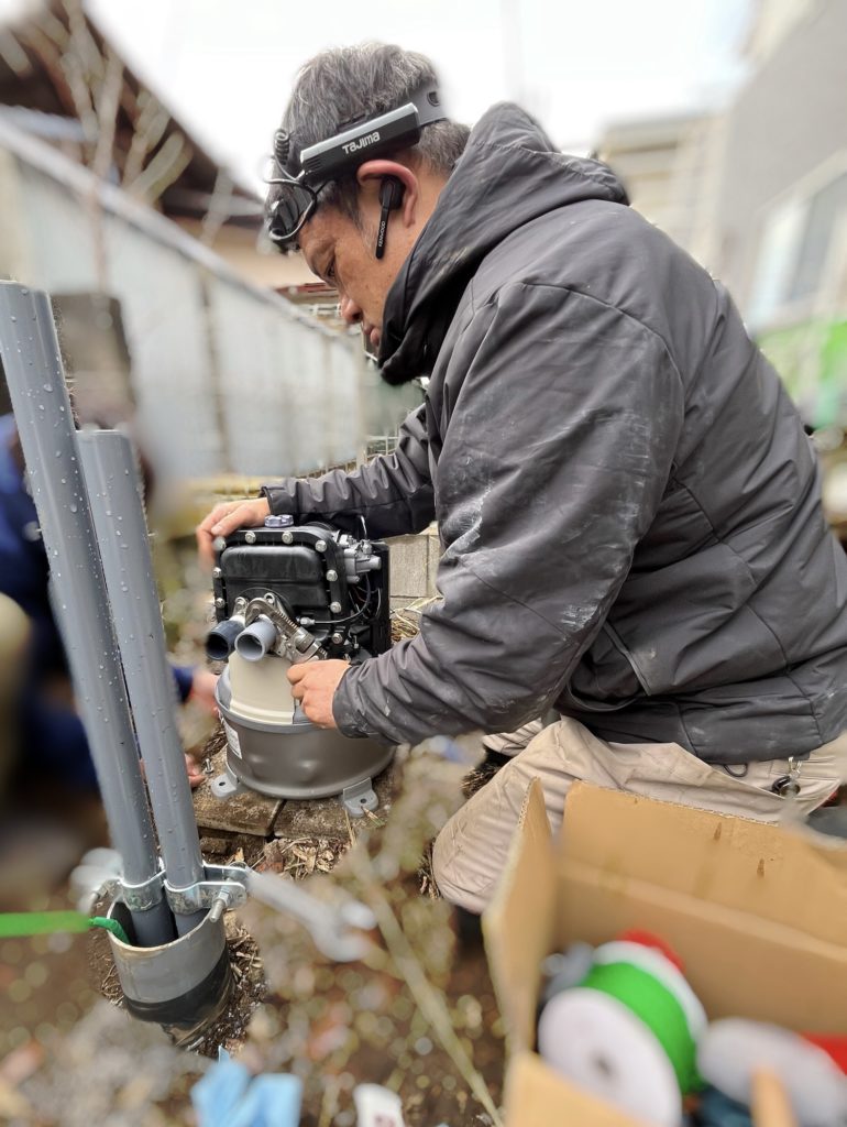 その後、新しい井戸ポンプと配管を繋いでいきます。また、電気系統も繋いでいきます。